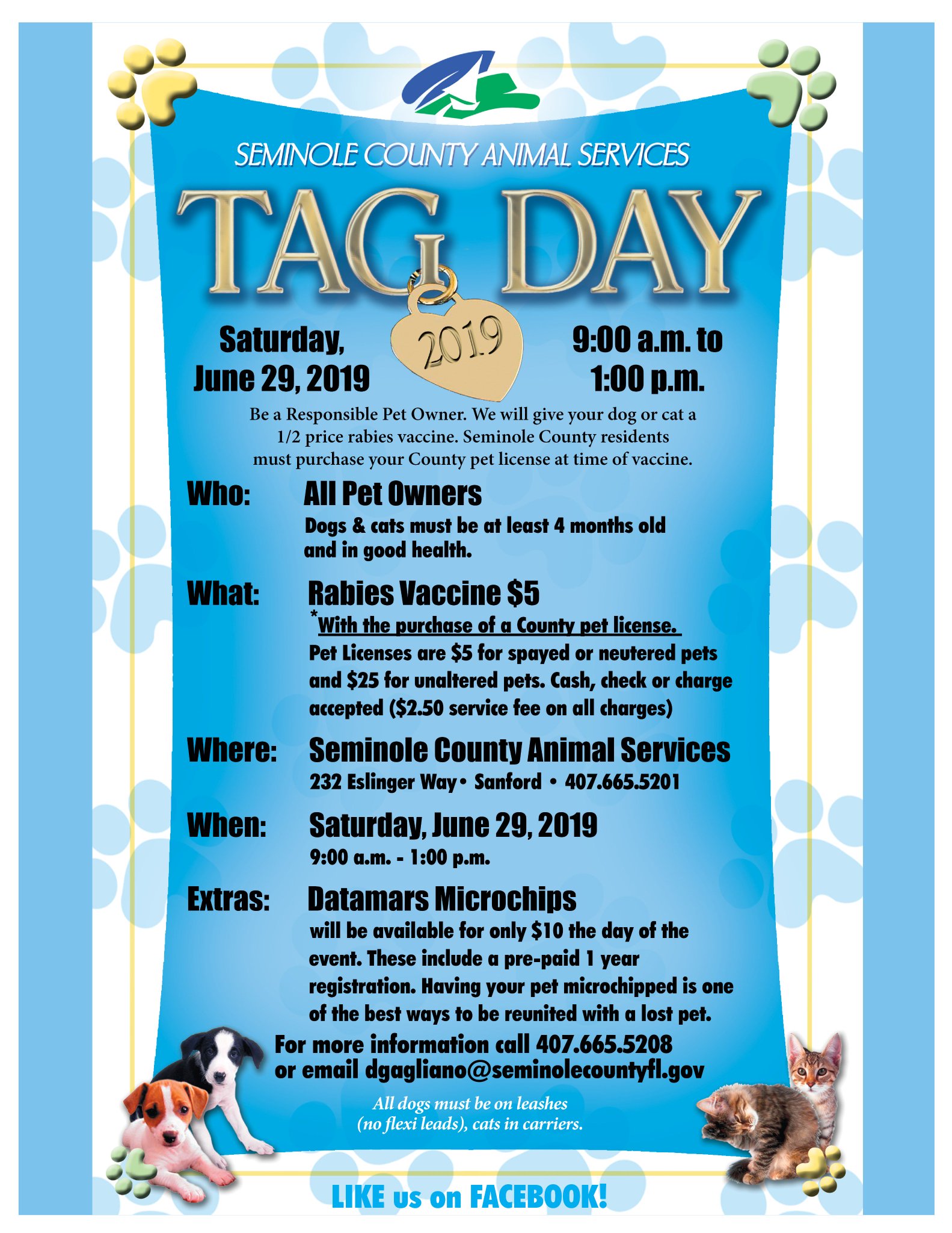 Seminole County Fl On Twitter Tag Day On Saturday June 29 Seminole County Animal Services Will Host Tag Day Anyone Who Purchases A Pet License Can Receive A 5 One Year Rabies Vaccine